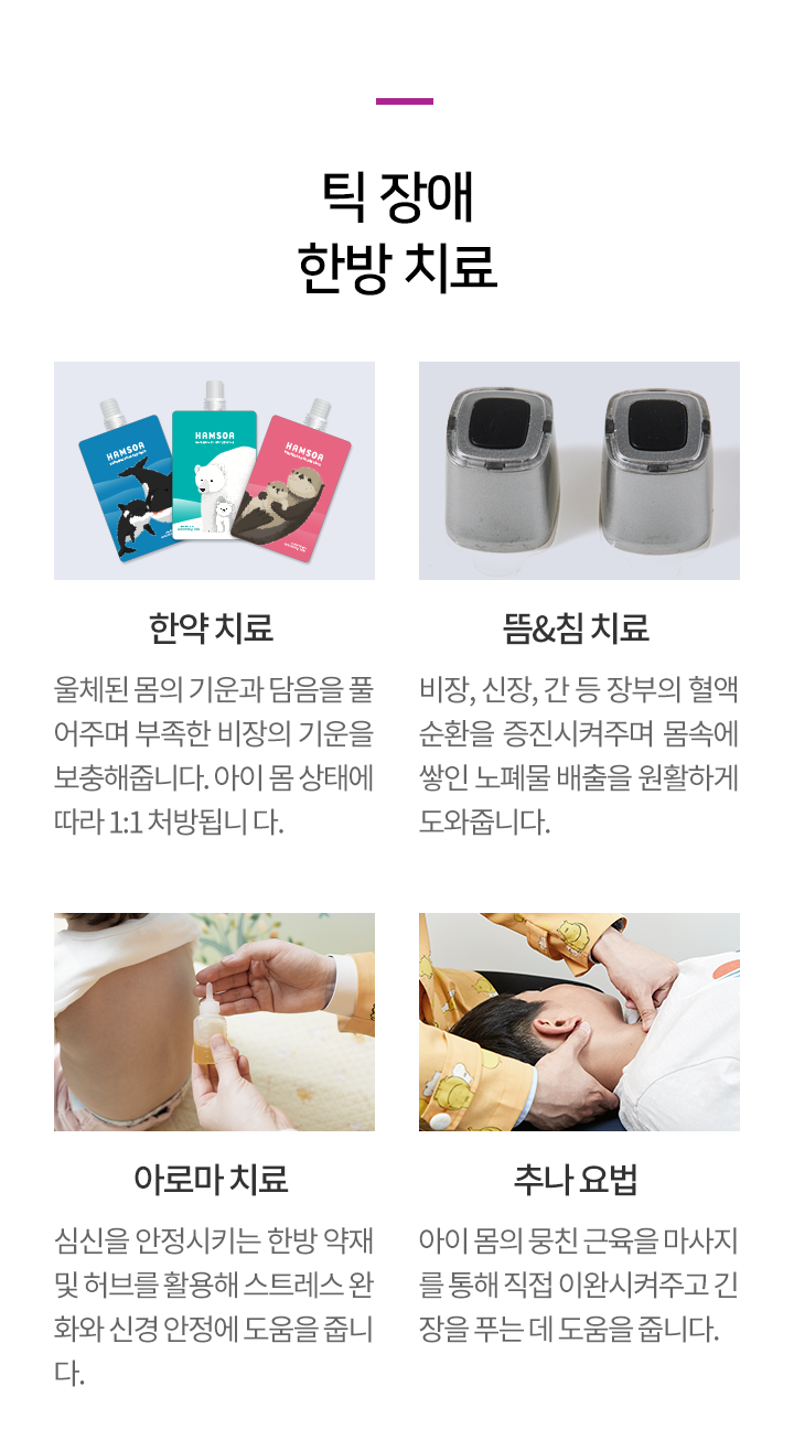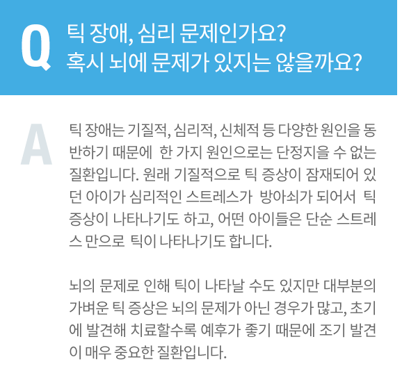 초기에 어린이 어린이 틱장애를 치료하지 않으면 만성적인 틱장애, 뚜렛장애 등으로 이어지기도 합니다. 뿐만 아니라 틱 장애는 강박, 불안, 우울증, ADHD 등의 다른 질환을 동반하는 경우도 많습니다.