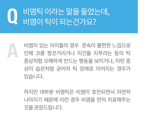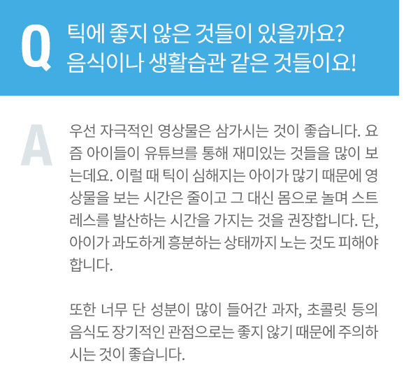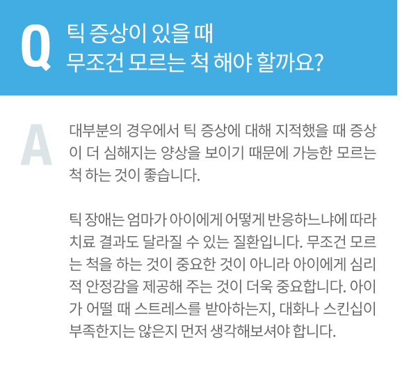 이후엔 전문가와 상담하는 것이 우선입니다. 틱 장애로 이어진다고 하더라도 조기 치료할수록 예후가 좋아집 니다. 틱 증상은 아이의 의도에 의해 발병하는 것도 아니고 의지로 치료되는 것도 아니라는 것을 기억하셔야 합니다.