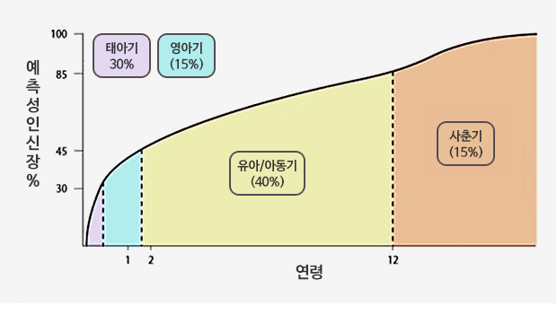 전체 성장곡선에서 보면 제2차 급성장기인 사춘기가 키 성장에 차지하는 비율은 15%로 사실 성장의 마무리 단계로 볼 수 있습니다.