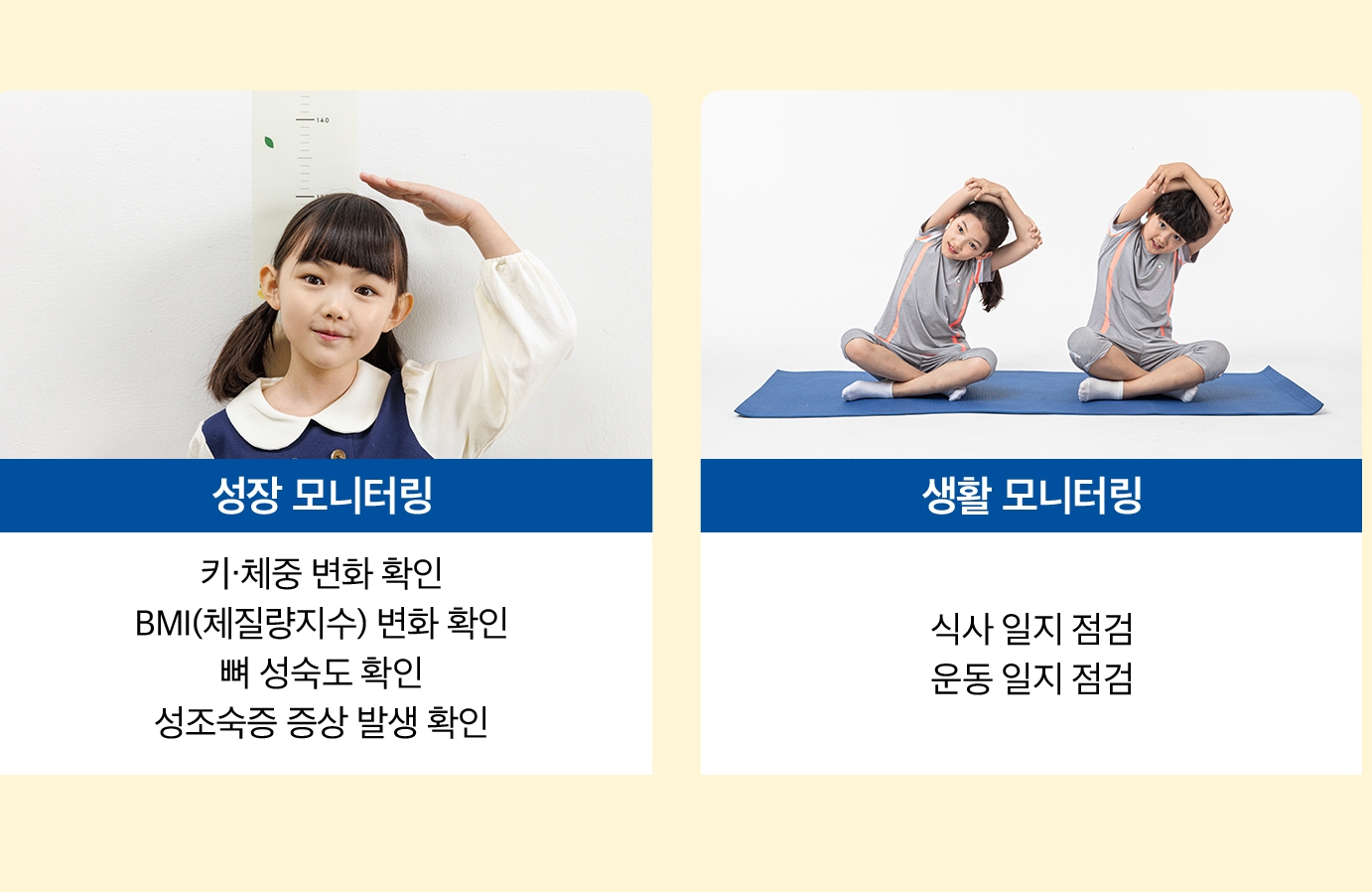 정기적인 모니터링을 통해 성장 방해 요인을 제거하고, 체내 에너지가 성장에 효과적으로 이용되도록 관리합니다.