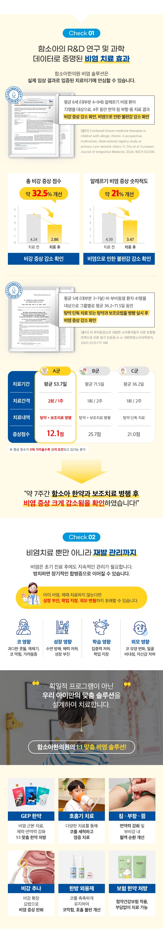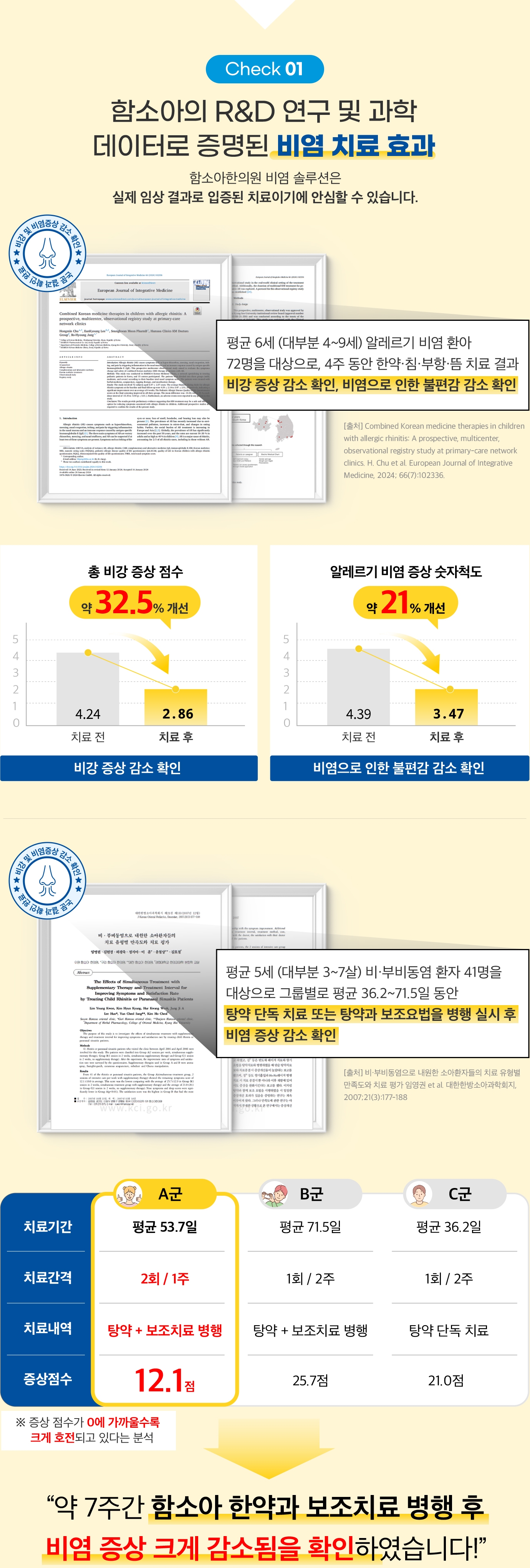 Check 1 함소아의 R&D 연구 및 과학 데이터로 증명된 비염 치료 효과입니다.