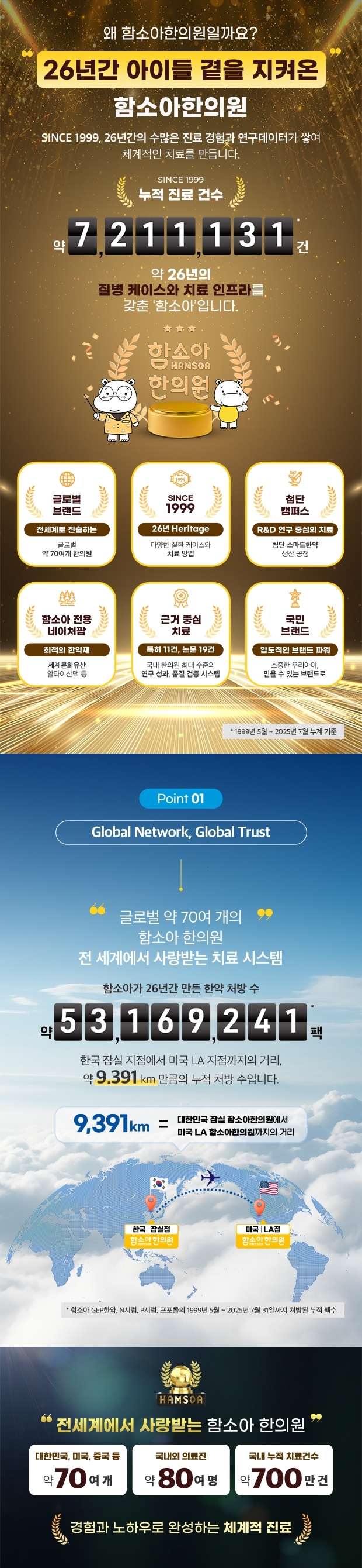 Point 1 함소아한의원은 전 세계 약 70여 개 분원을 운영 중이며, 26년간 5천만 팩 이상의 한약을 처방해 왔습니다.